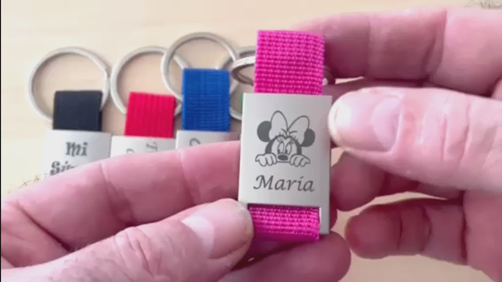 Llavero personalizado de metal acabado mate con correa decorativa. Grabado láser imborrable sobre el metal en dos caras con texto, logo o dibujo.
